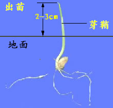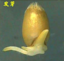 当种子吸水达自身干重的45%-50%时开始萌发,胚根鞘首先突破皮层,称为露白,也称为萌发。胚根鞘长约1mm时,主胚根伸出胚根鞘,接着从胚轴两侧生出第一对侧根。当芽长达种子长度一半时,称为发芽。小麦种子发芽后,芽鞘向上伸长顶出地面,为出土。胚芽鞘见光后停止伸长,接着,第一片真叶从芽鞘顶端伸出。当第一片真叶伸出芽鞘2-3cm时,为出苗;田间有50%苗达到出苗标准时为出苗期。