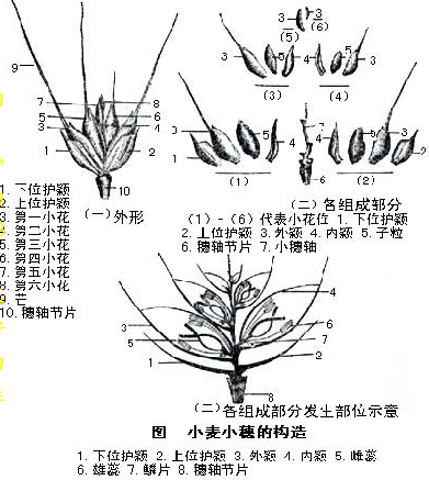 麦穗是由小麦和着生在小穗的穗轴组成。穗轴由明显的节片组成,节片的顶端着生小穗。小穗由两枚护颖及若干小花组成。一般一个小穗的小花数为3-9朵,通常结实的约2-3 朵,小花由外稃和内稃(各一枚)、鳞片(两枚)、雄蕊(三枚)和雌蕊(一枚)组成。受精后子房发育成精粒。有些品种外稃顶端着生芒。芒的有元、形状、长短、颜色是品种特性之一。