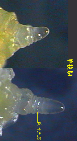 2)单棱期:也称穗轴分化期。生长锥继续伸长,并从生长锥基部由下向上分化出环状突起,为苞叶原基。苞叶原基在小穗原基分化出现后退化。每节一个苞叶原基,呈单棱状,故称为单棱期。苞叶原基着生在穗轴上,所以也称为穗轴分化期。此期分化的苞叶原基数较多,将来分化的小穗数也多。