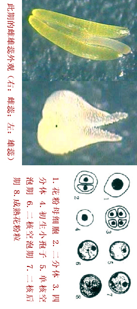 7)四分体形成期:花粉囊内孢原组织进一步发育为花粉母细胞,经过减数分裂形成四分体。此时小花分化数达最高峰,是小花两极分化、决定有效小穗、小花的重要时期,植株形态上进入孕穗期。