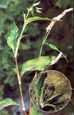 又名大马蓼、斑蓼、旱苗蓼。蓼科一年生草本。茎直立,有分枝,叶柄有短刺毛;叶披针形或宽披针形,上面绿色,常有黑褐色新月形斑点,无毛,全缘。托叶膜质,淡褐色,无毛。花序由数个花穗构成的圆锥状花序;花淡红色或白色。果扁平,褐色,光亮,全部包于花被内。